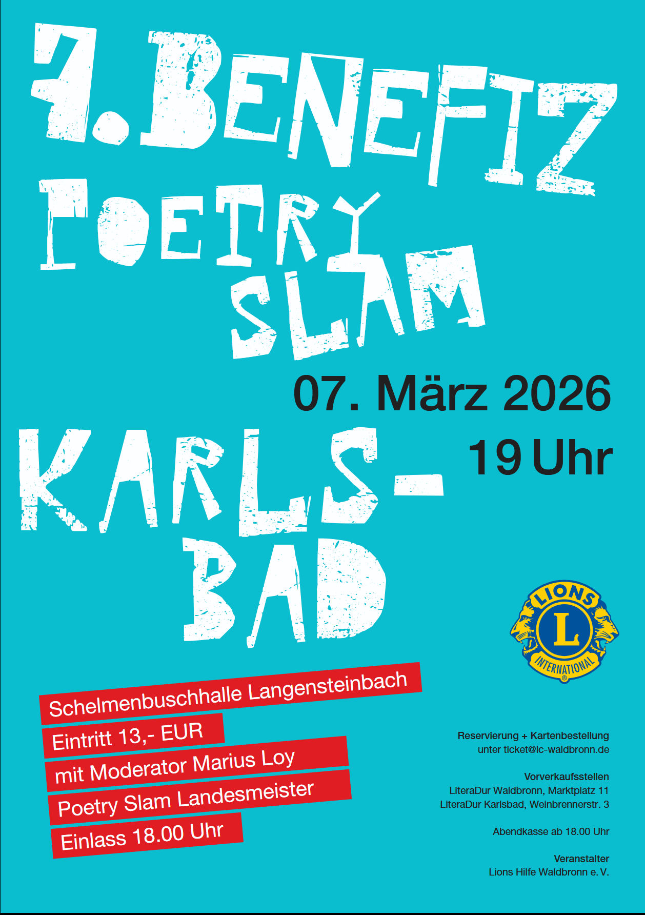 Ein Mikrofon, sechs Minuten und eine bunte Mischung aus Wortakrobatik, Lyrik, Witz und Euphorie sind das Erfolgsrezept des Poetry-Slam, eines modernen Poeten-Wettstreits. Der Lions Club Waldbronn veranstaltet zum siebten Mal einen Poetry-Slam, zu ersten Mal in KARLSBAD-LANGENSTEINBACH in der SCHELMENBUSCHHALLE.